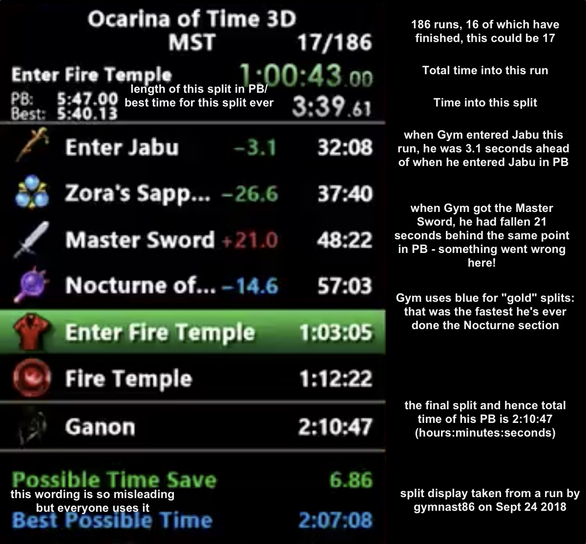 Here is a labeled split display taken from a MST (medallions-stones-trials) run of Ocarina of Time 3D by gymnast86: