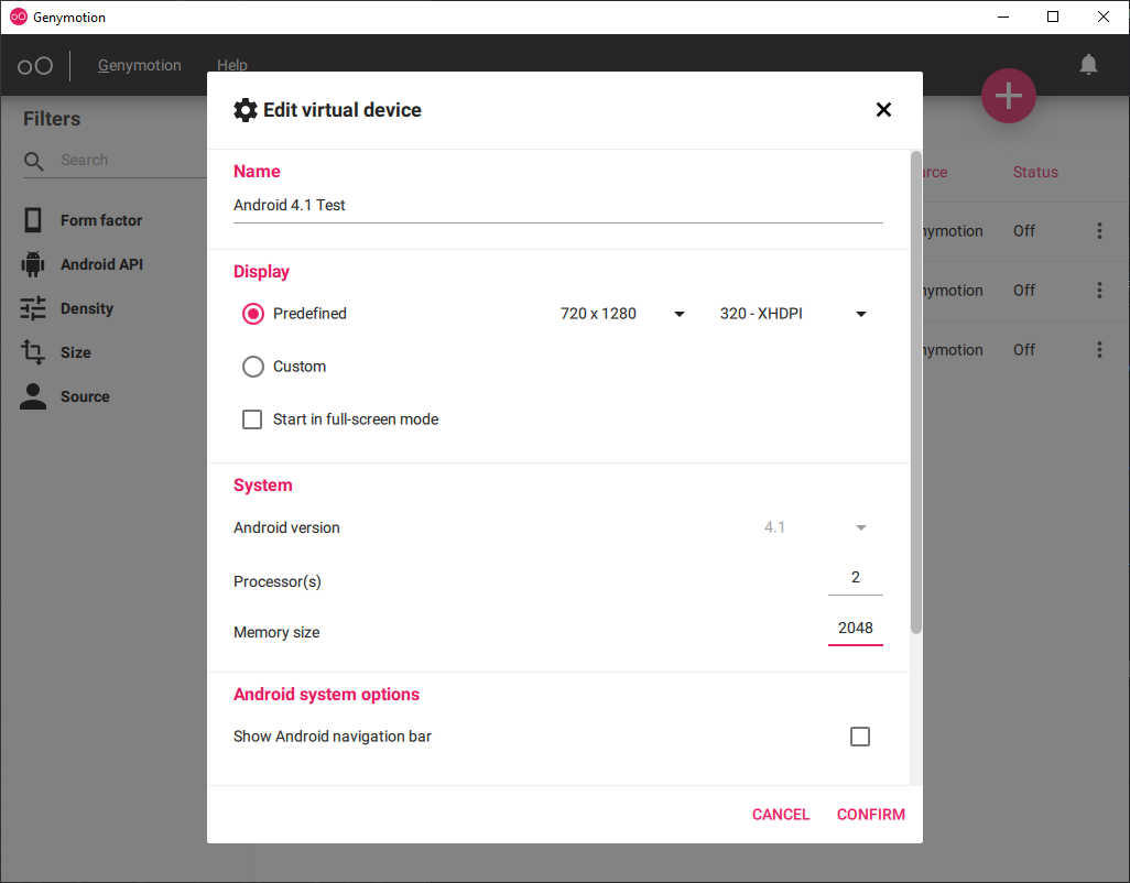 Optional: Edit Device's settings from the 3 dot menu (eg. Change resolution, Increase RAM and CPU Cores).