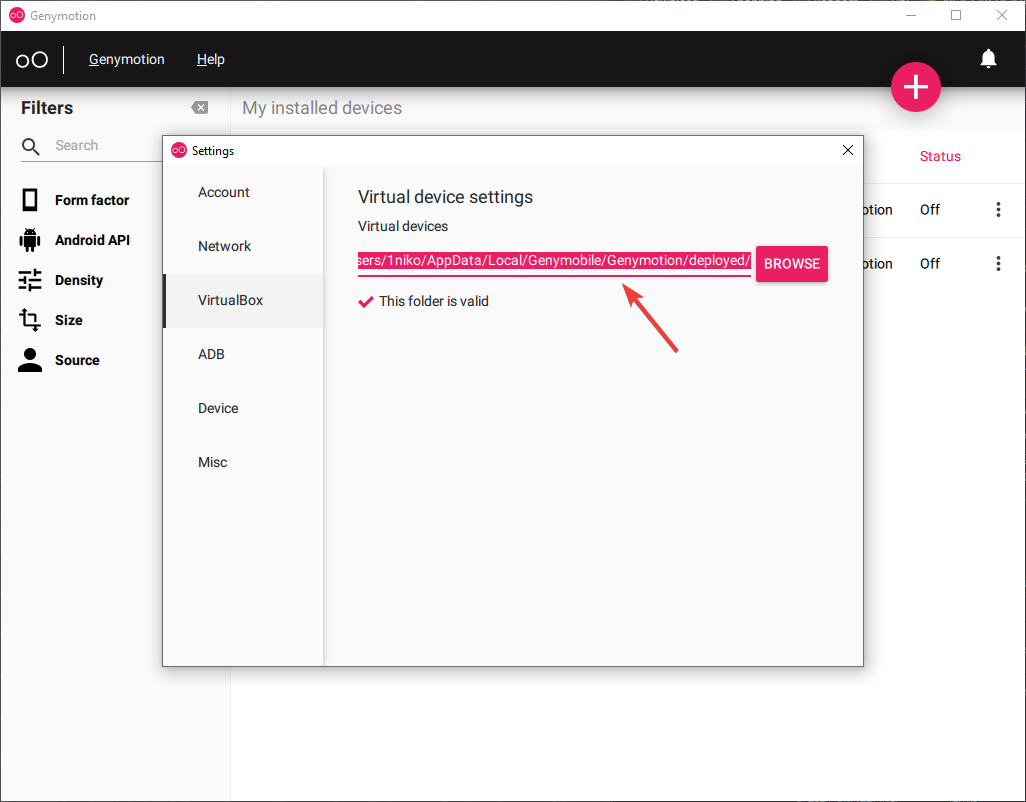 Then go to Virtualbox tab and copy the Virtual Devices path