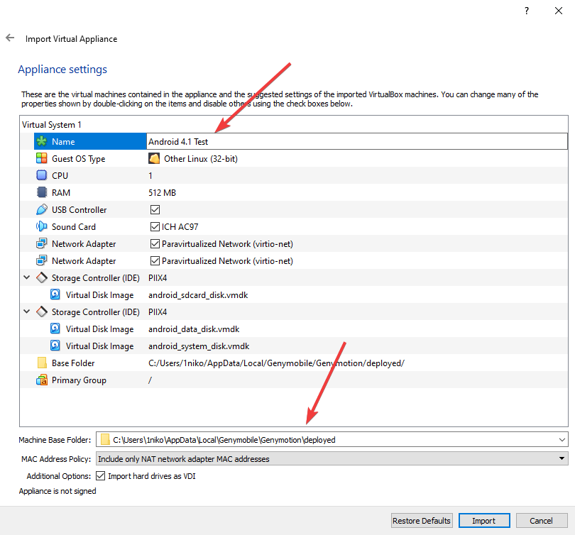 On the next screen you need to change the Machine Base Folder to the path you copied on Step 2. You can also change the name to something more distinguishable if you want. Leave everything else as is (VM specs can be changed later via Genymotion).
