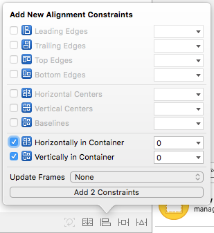 画面が回転した場合でも上下中央位置に表示させたい場合にはConstraints(制約)を指定してあげる必要があります。ラベルを選択したあと、ストーリーボード編集画面右下のボタンを押し、下図のような設定にチェックを入れ Add 2 Constraints ボタンを押してください。それぞれ Horizontally in Container は水平方向中央揃え、Vertically in Container は上下方向中央揃えの意味となります。最後に右下5つアイコンがならんでいる部分の一番左、更新マークのボタンを押すと、追加された制約がストーリーボードに反映されます。