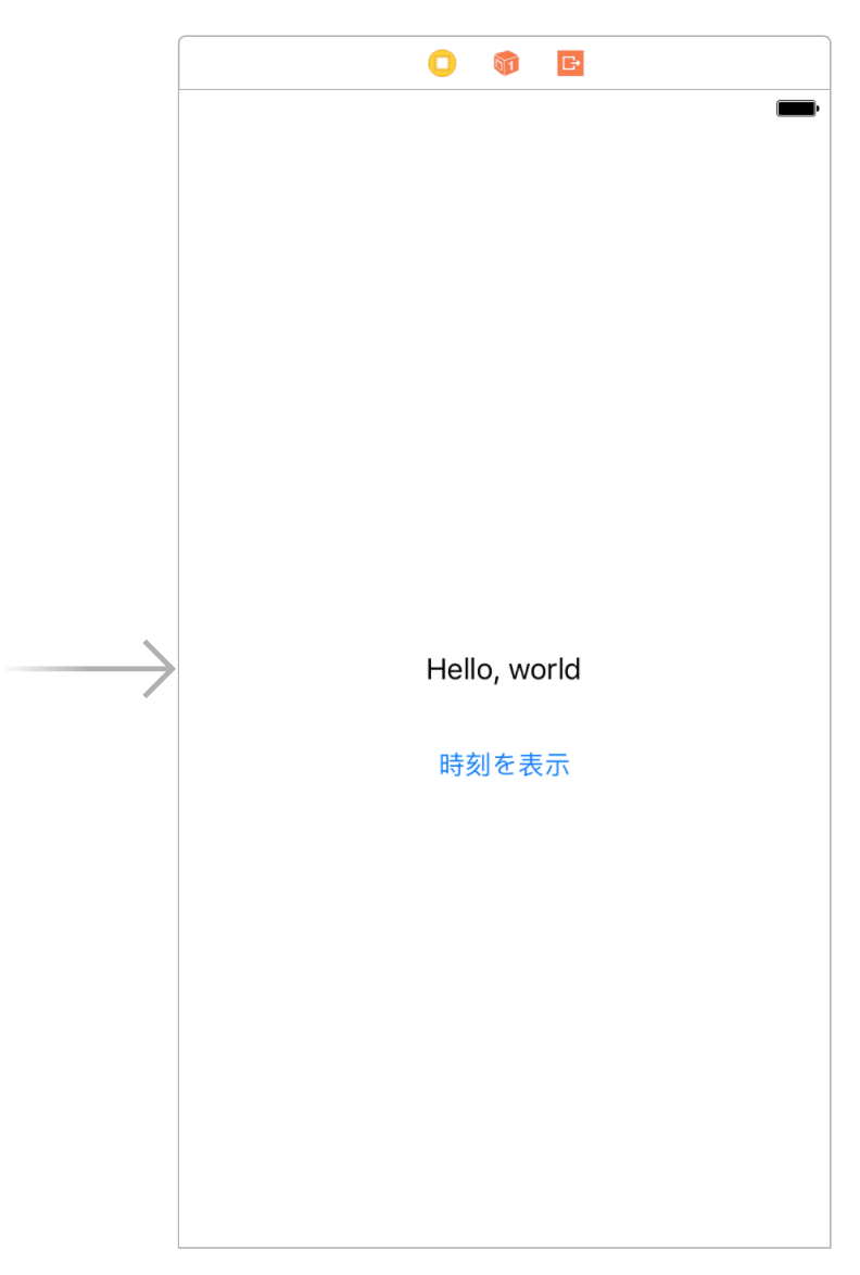 画面にただ単に Hello, world と表示されているだけではつまらないので、ボタンを設置して、押したときの時刻が表示される機能を搭載してみましょう。まずはストーリーボードに対して下図のようにボタンを追加してください。