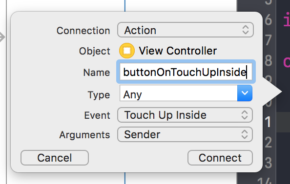 ついでに、同じ仕組みを異なる方法で実装しておきましょう。一旦ストーリーボードのボタンを control キーを押しながらクリックして、New Referencing Outlet に紐付いているものを削除し、もう一度 control キーを押しながらソースコードへドラッグします。その際に下記のように Connection を Action に変更します。この場合 Name の欄にはボタンの名前ではなく action の名前を指定することになるので buttonOnTouchUpInside など適当な名前を指定してあげてください。すると今度はメソッド定義が生成されたのではないでしょうか。この手法ではこうして生成されたメソッド内に、ボタンが押されたときの挙動を定義していくことになります。