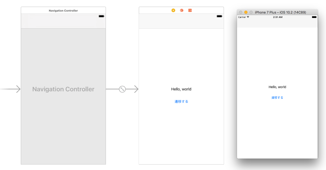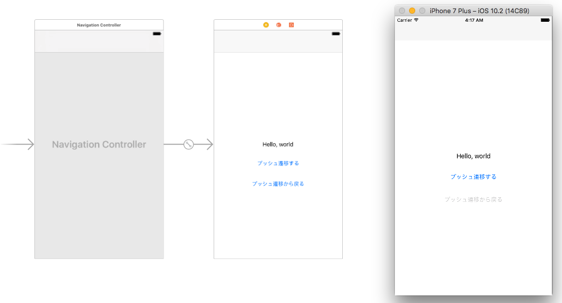 } この状態でシミュレーターで実行すると、ボタンを押したときにきちんとプッシュ遷移できるようになっているのではないでしょうか? またスワイプや左上の < ボタンで前の画面に戻れるようになっていると思います。