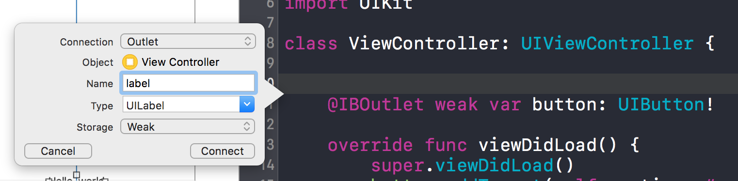 Name に label と入力し Enter を押すと @IBOutlet weak var label: UILabel! というコードが追加されると思います。これはストーリーボード上にあるラベルをコードから操作できるようにリンクしてあげたと思っていただければ大体良いと思います。ボタンに関しても同様に操作を行うと @IBOutlet weak var button: UIButton! というコードが追加されるでしょう。