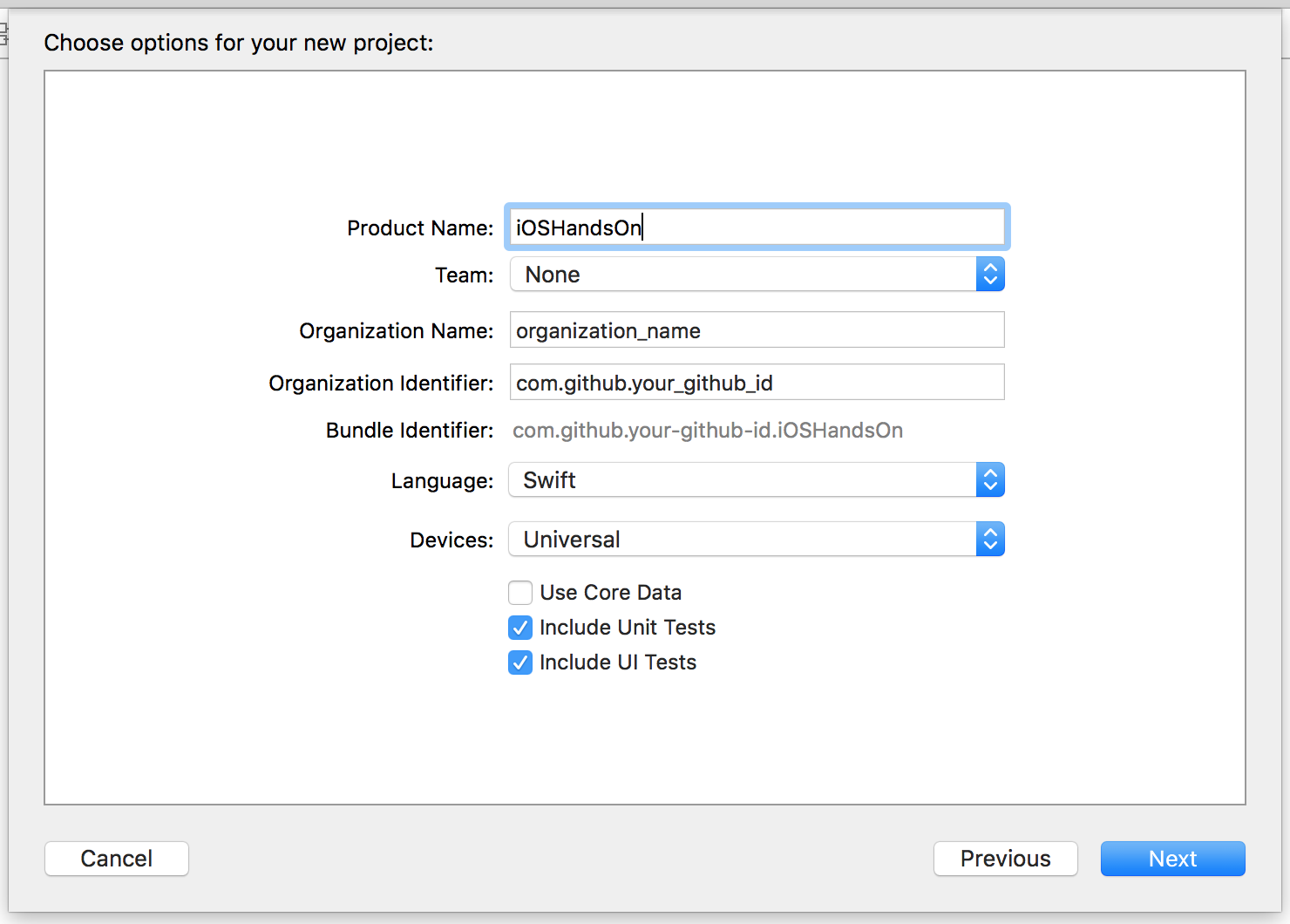 ProductName として、とりあえず今回のハンズオンでは iOSHandsOn を指定しておきましょう。また、Organization Name は適当に、Organization Id についてはサービスのドメイン名や、github の id を指定することが多いかもしれません。