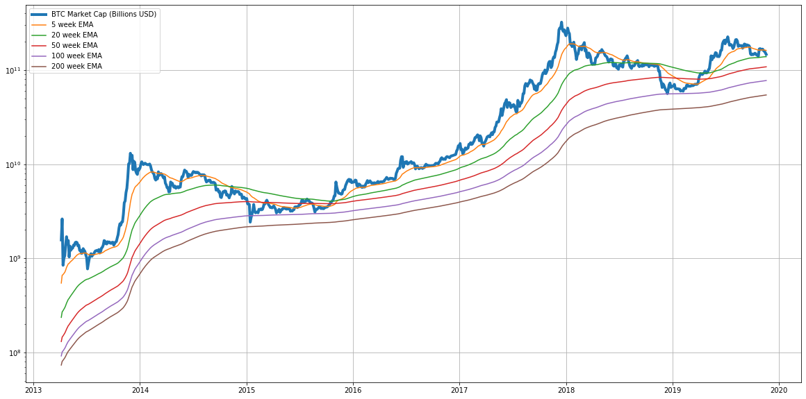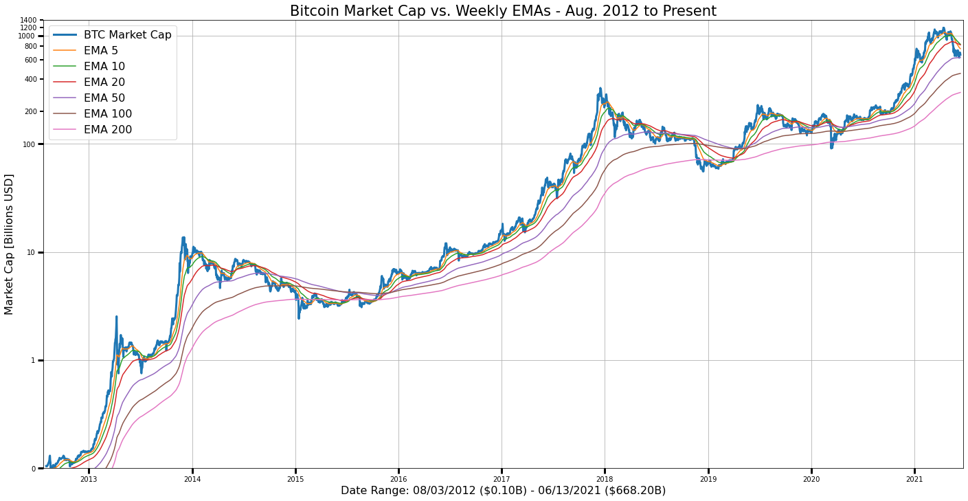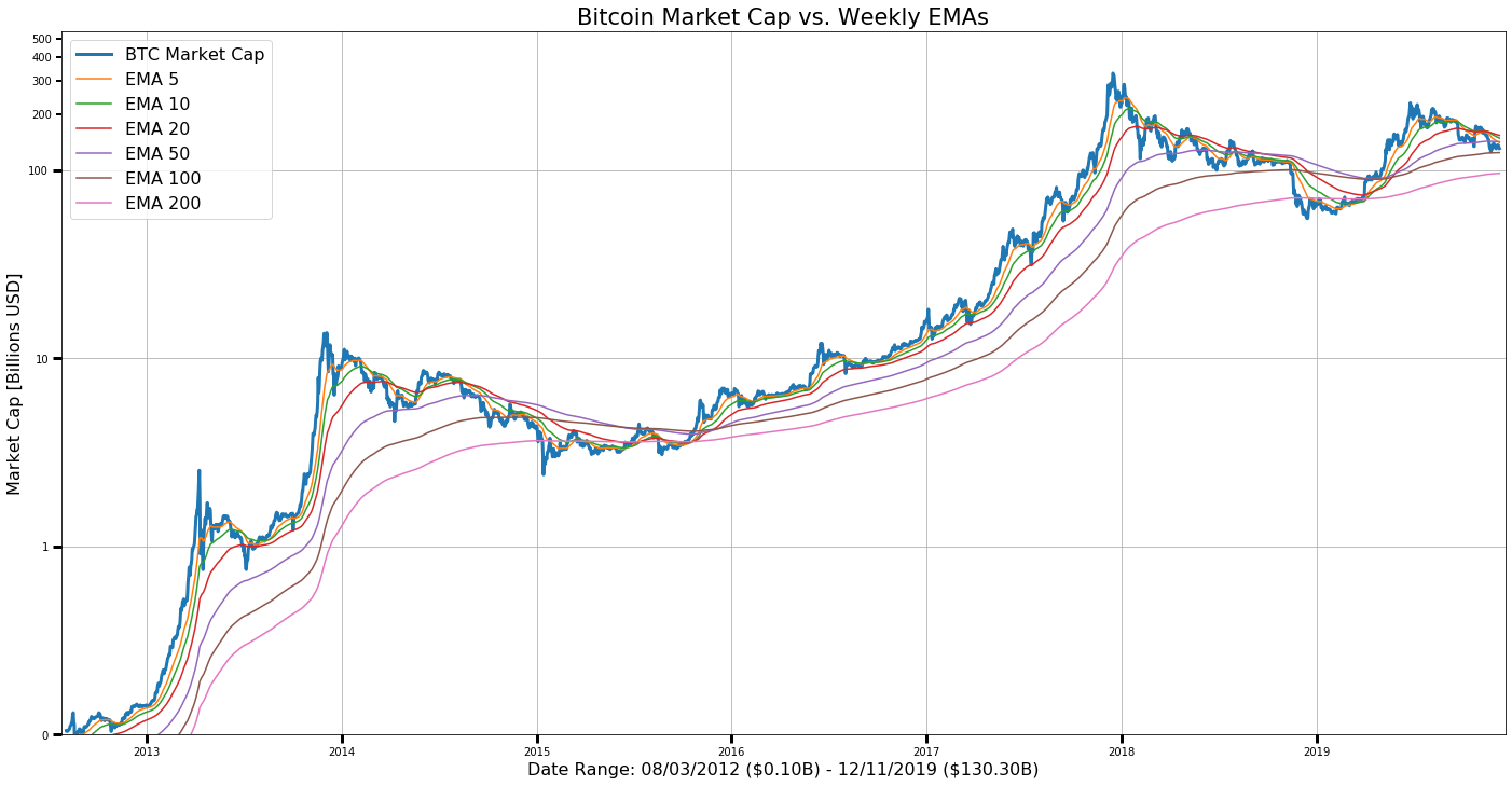 Plot BTC Market Cap Weekly EMAs