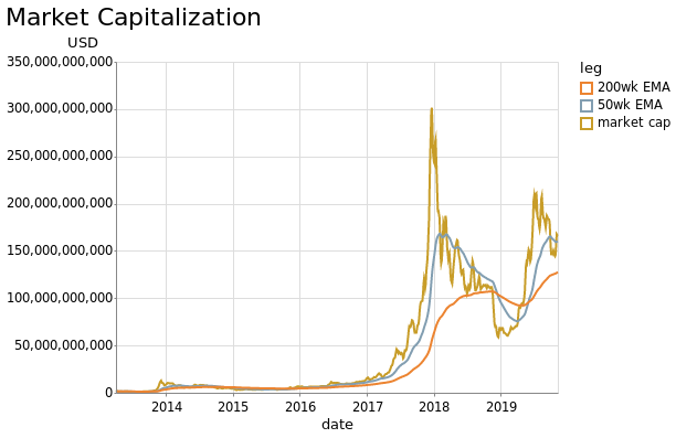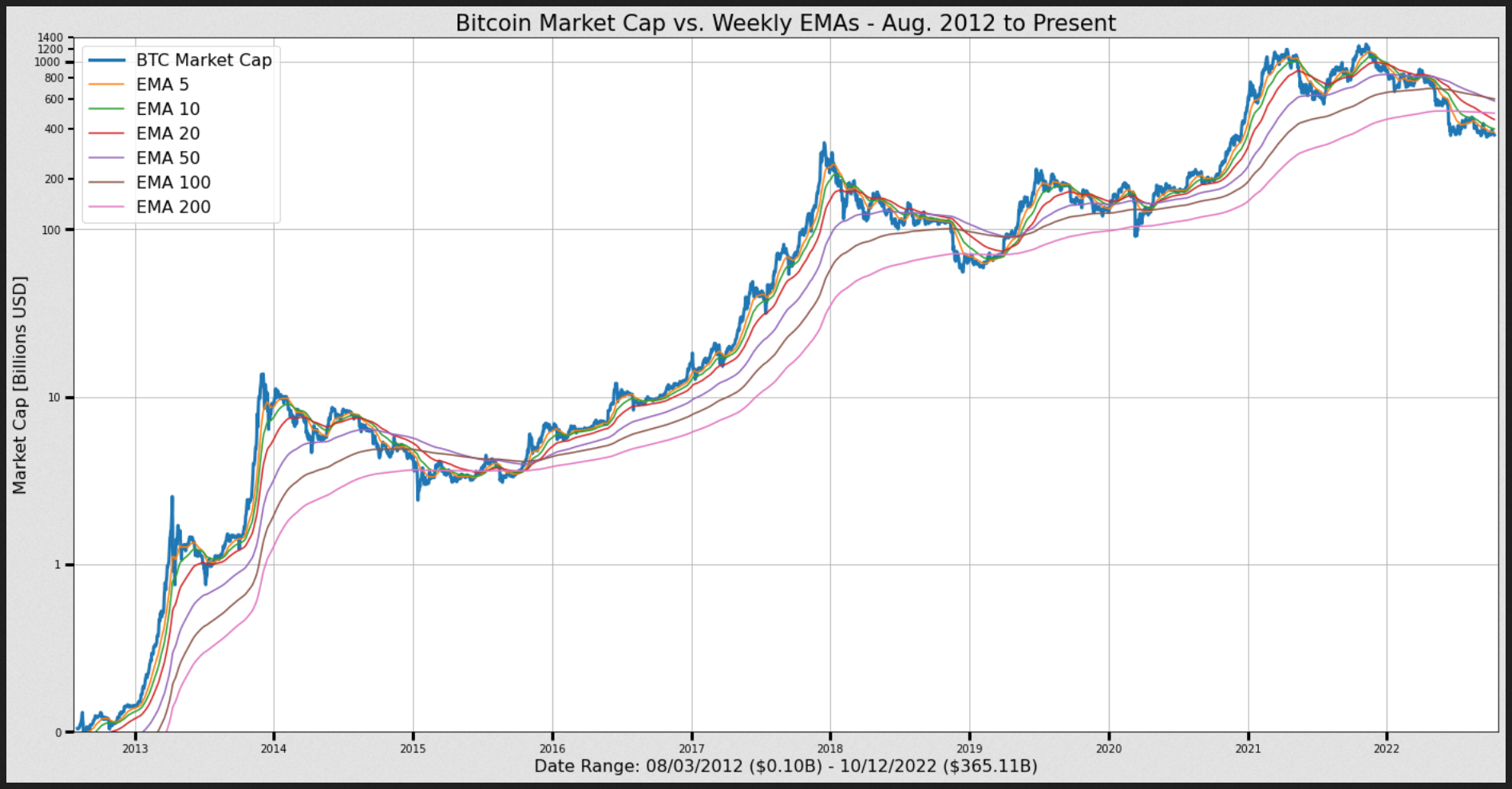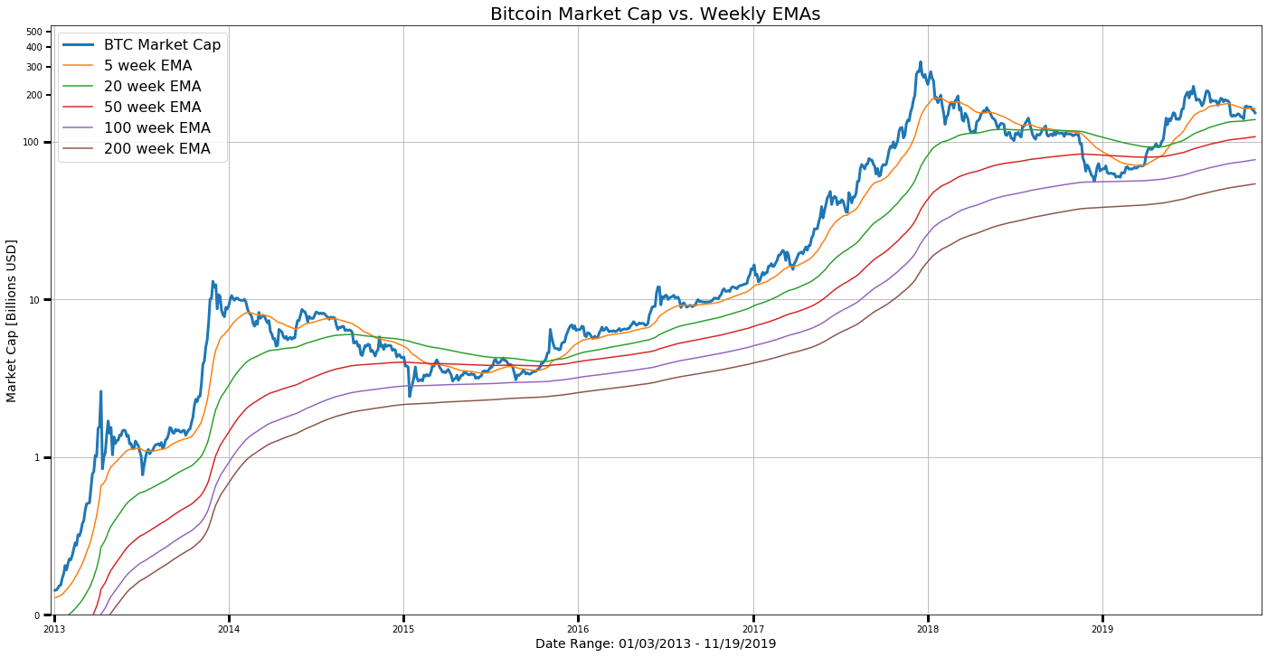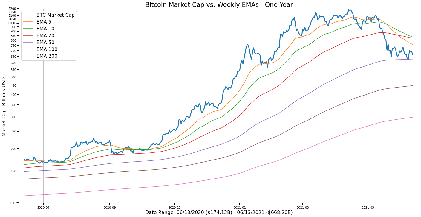 Plot BTC Market Cap Weekly EMAs