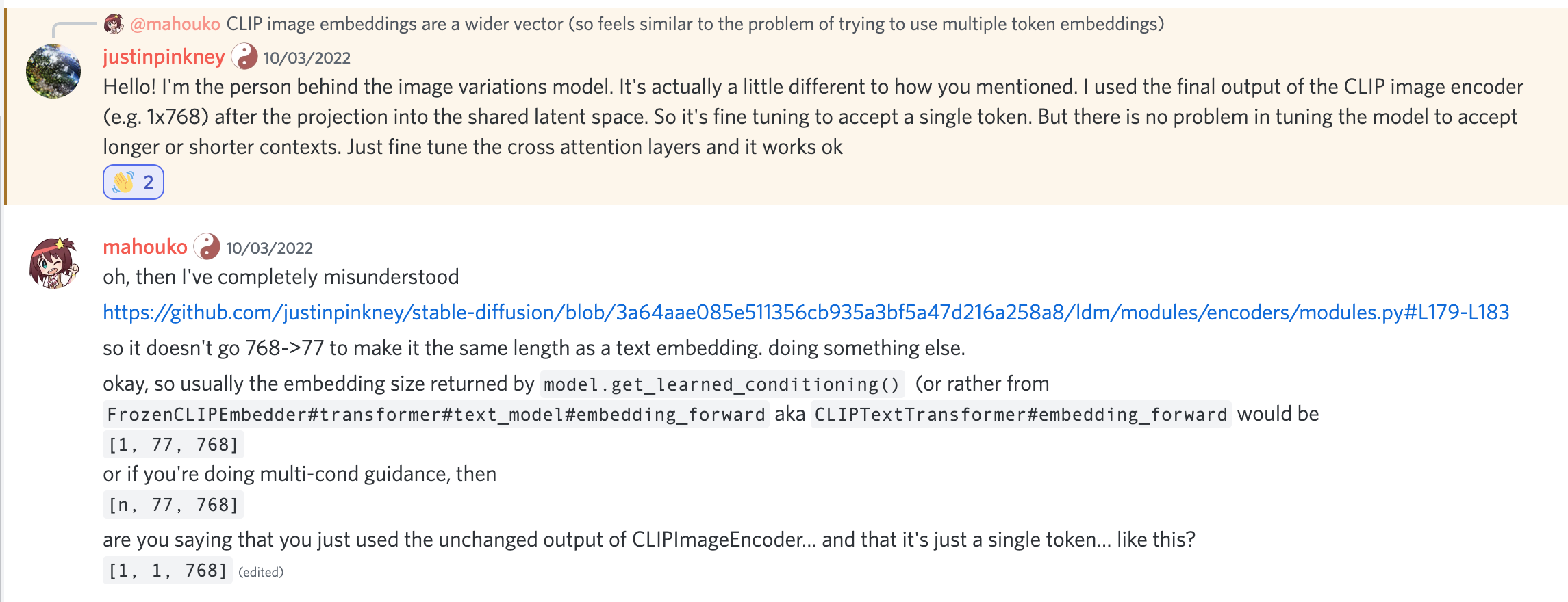 Asking justinpinkney how stable-diffusion image variations works (i.e. how to finetune SD to condition on CLIP image embeddings)