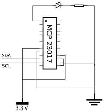 Now to turn it on. (Connect the LED first, if you haven't already. Its + terminal connects to pin 1 on the MCP, its - terminal connects to ground via a suitable resistor.) The register we use for this is GPIOB at address 0x13. Write a 1 to bit 1 of this register and the LED should turn on: i2cset -y 0 0x20 0x13 0x01. Write a 0 again to turn it off: i2cset -y 0 0x20 0x13 0x00.