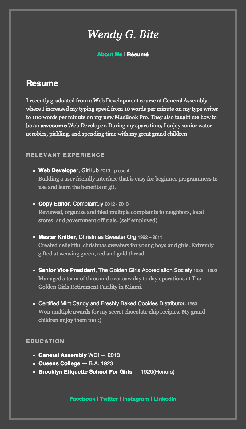 | I recently graduated from a Web Development course at General Assembly where I increased my typing speed from 10 words per minute on my type writer to 100 words per minute on my new MacBook Pro. They also taught me how to be an <strong>awesome</strong>Web Developer. During my spare time, I enjoy senior water aerobics, pickling, and spending time with my great grand children. | |