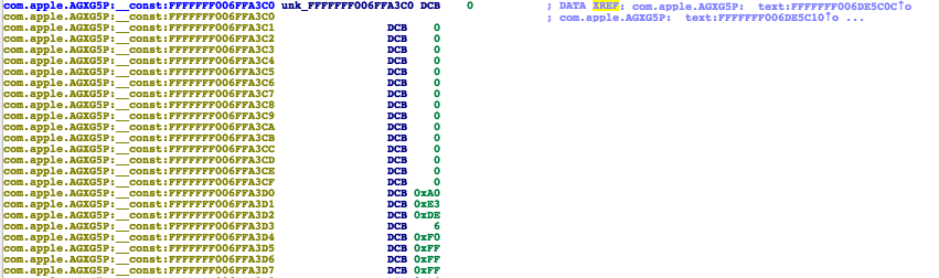fStampMapping[kAGXHostMemoryTimestamp]This should take you tocom.apple.AGXG5P:__cstringsection. - Double click on the first text:FFFFFFF...