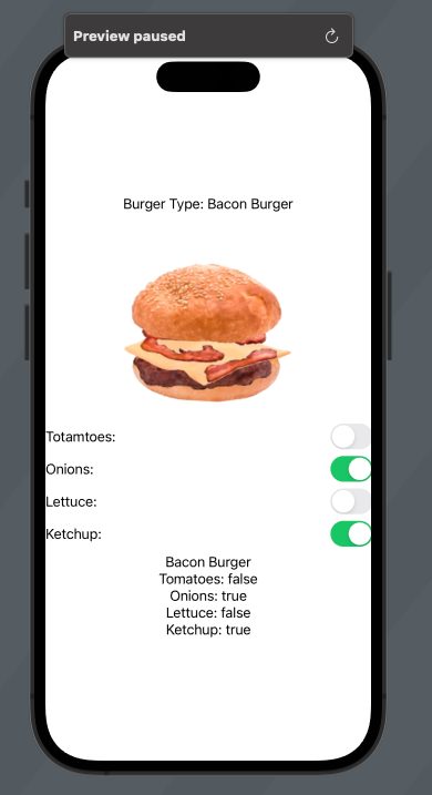 | Toggle("Totamtoes: ", isOn: $burger.tomatoes) | |