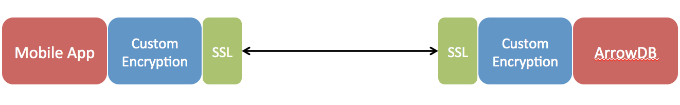 Appcelerator mobile applications use Secure Sockets Layer (SSL) for encrypting and decrypting all data transmitted and received by the device. However, for certain applications, one may want to add another layer of encryption for added security. This post describes how to programmatically add additional encryption for data in transit between an Appcelerator application and an ArrowDB as illustrated below.