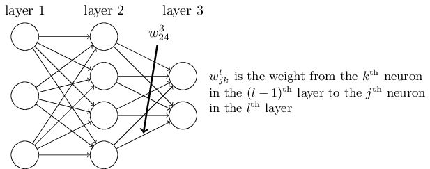Let's begin with a notation which lets us refer to weights in the network in an unambiguous way. We'll use $w_{jk}^{l}$ to denote the weight for the connection from the $k^{th}$ neuron in the $(l−1)^{th}$ layer to the $j^{th}$ neuron in the $l^{th}$ layer. So, for example, the diagram the below shows the weight on a connection from the $4^{th}$ neuron in the $2^{nd}$ layer to the $2^{nd}$ neuron in the $3^{rd}$ layer of a network: