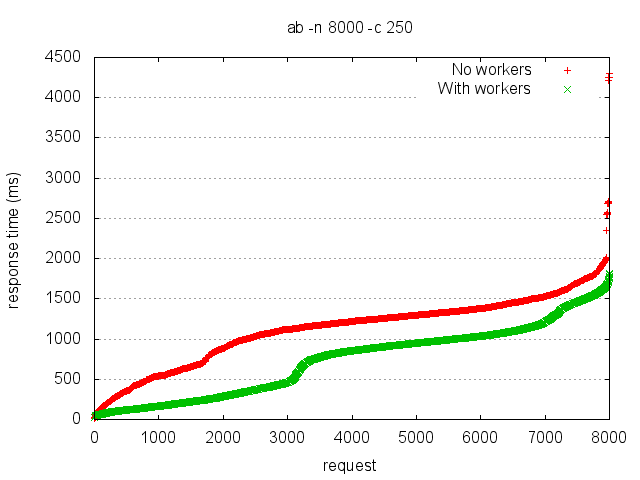 In the red series, the http server is running in the same process as the Fibonacci calculations. In the green series, the handling of all of the http web server stuff has been moved to separate node workers. In both cases, the Fibonacci calculations occur in a single thread in the main (master) Node process.