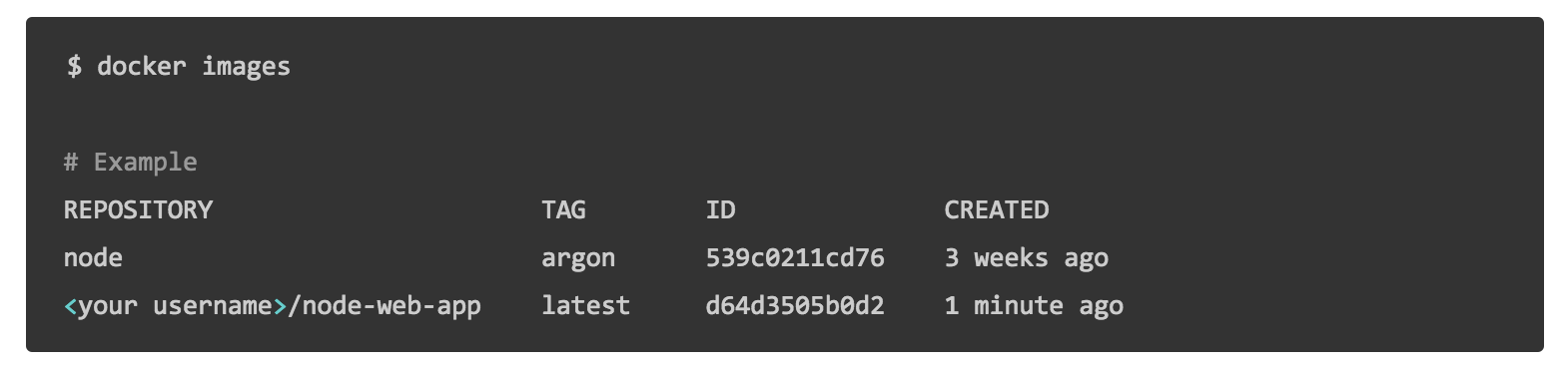 在這邊的意思是,從 node 這個 base image 中,選擇 argon 這個 tag 所標示的版本來建立這個 image。在建立的過程中,先建立一個 /usr/src/app 資料夾,並且使用這個資料夾當作以下指令的工作目錄。指定完工作目錄後,copy package.json 這個檔案到工作目錄下,接著執行 npm install。接著繼續 copy 所有的檔案到工作目錄下,然後開放 8080 port。最後則是執行 command npm start。