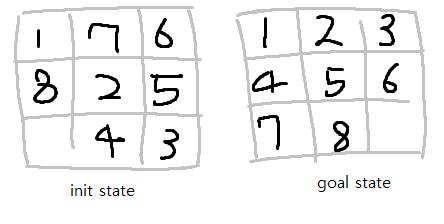 - 8-puzzle에서의 시작, 목표 상태는 다음과 같음