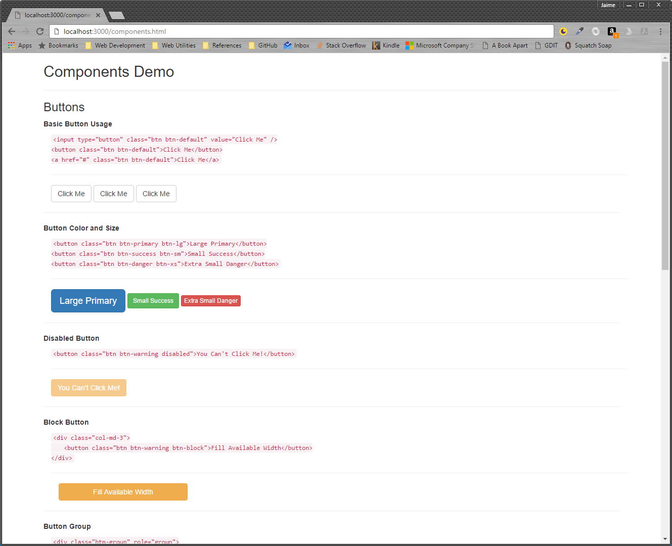 </html>Now, run the app with the gulp command, and navigate to http://localhost:3000/component.html to see the magic of bootstrap components