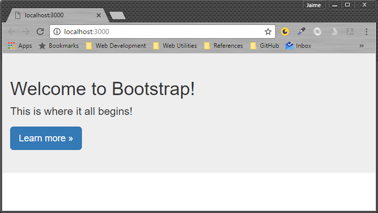 </html>Open the file in the browser of your choice, and behold, you have bootstrap working! All you need to have in order to run bootstrap are references to bootstrap.css, the jquery library, and bootstrap.js. In the above demonstration, rather than saving the files locally with the HTML file, they are simply being referenced from a Content Delivery Network (CDN).