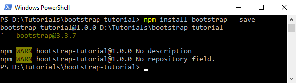 This command adds installs bootstrap to the directory location of the command prompt. Specifying --save adds bootstrap as a dependency to the package.json file. The rest of the following install commands complete the same function for the libraries that they install. The only difference is that, for commands that use the --save-dev flag, the associated libraries will be saved as devDependencies rather than just dependencies. What this implies is that these tools are only needed for use in the development environment, not the actual web app itself.