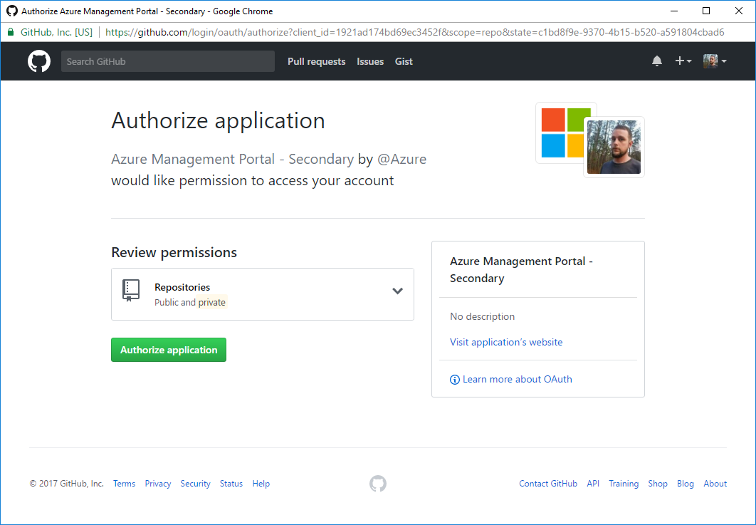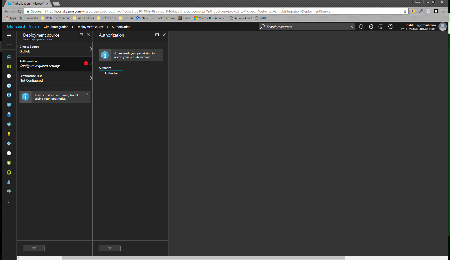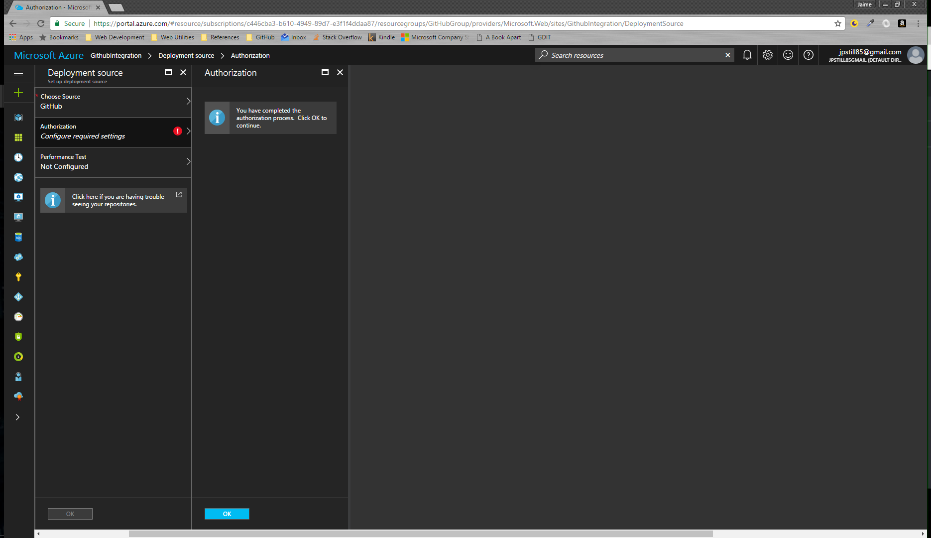 Under Authorization, click Authorize and to allow Azure permission to access your GitHub account. Once authorized, click OK at the bottom of the Authorization window.