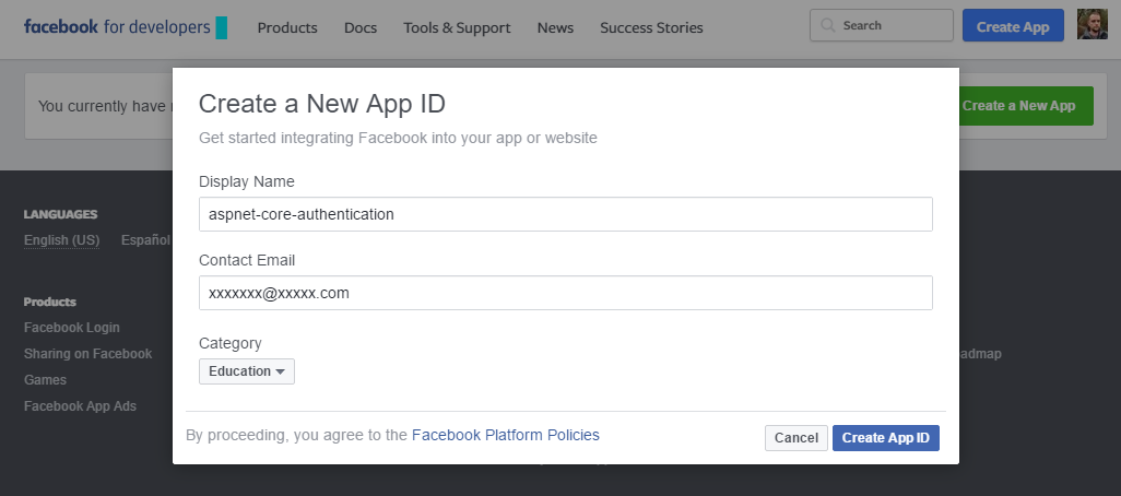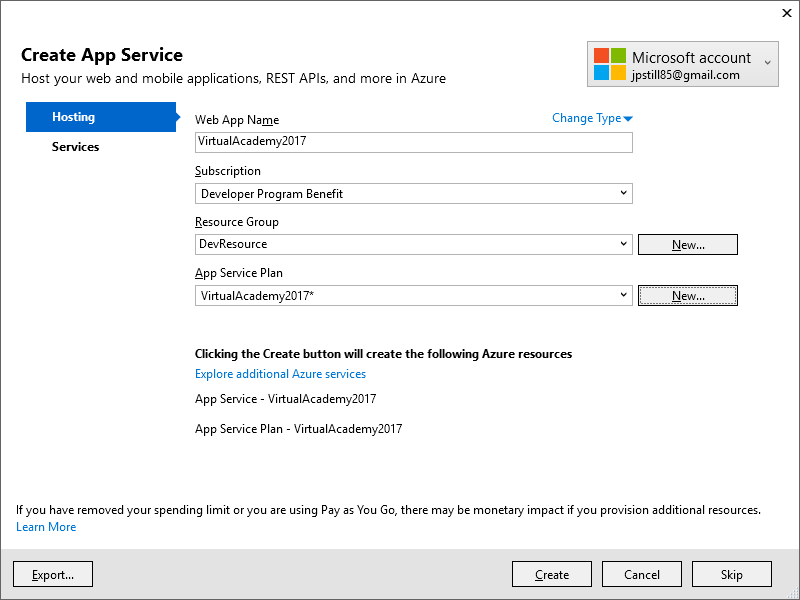 Back in the Create App Service window, provide a name for the web app, select your azure subscription, select the resource group created above, and select the app service plan created above. Click Create to scaffold the web app and provision resources in Azure for the web app to be published.