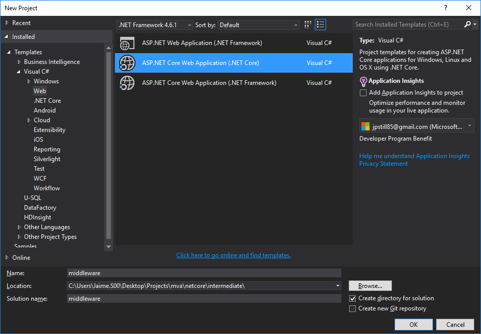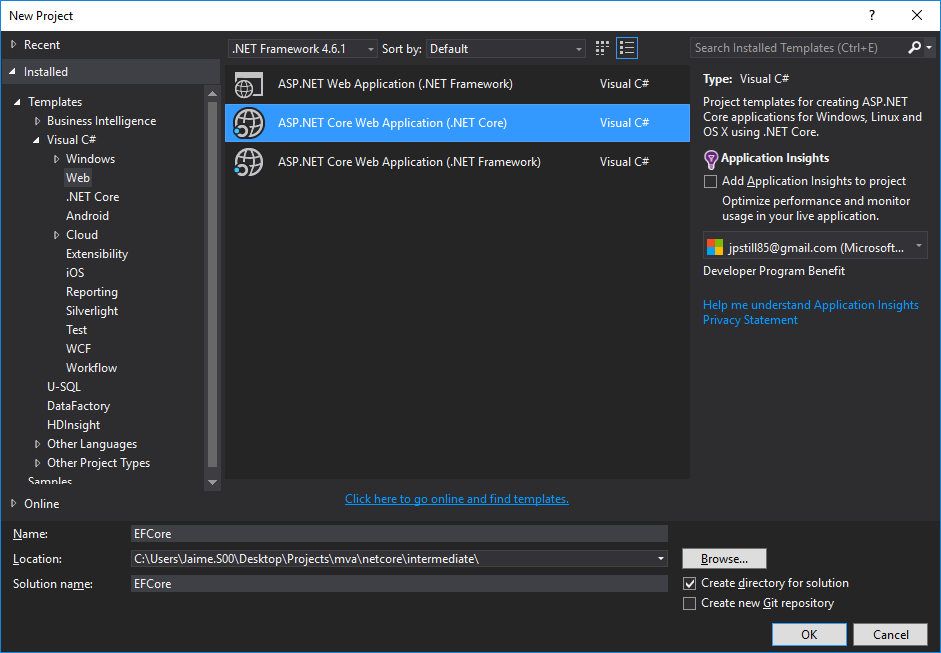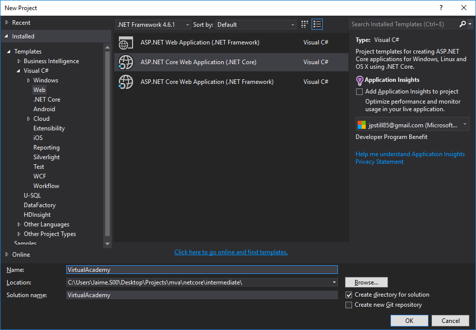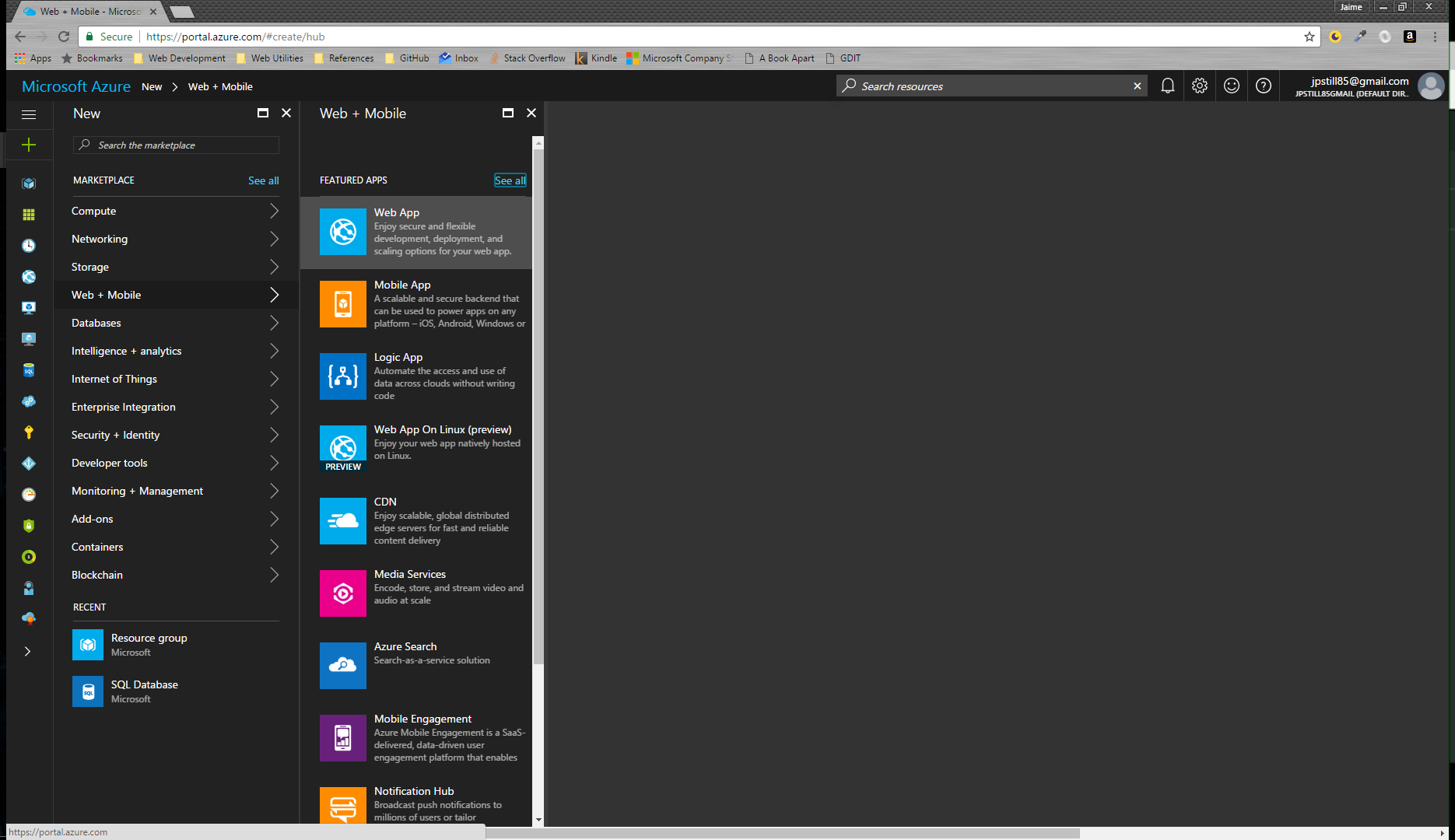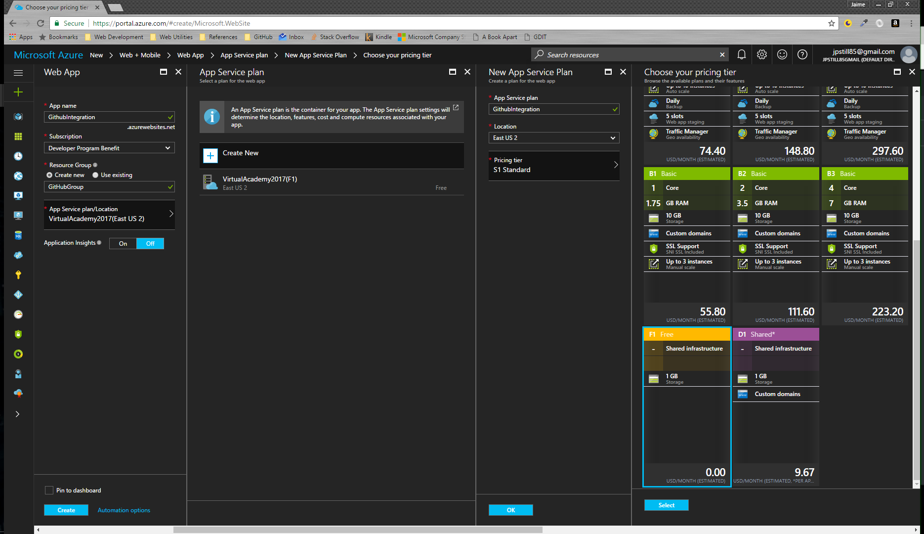 Configure the web app by providing a name, setting the associated azure subscription, create a new resource group name, and configure the app service plan. When configuring the app service plan, provide a name, region to host the service, and pricing tier (I'm using the Free pricing tier). Click Create when finished.