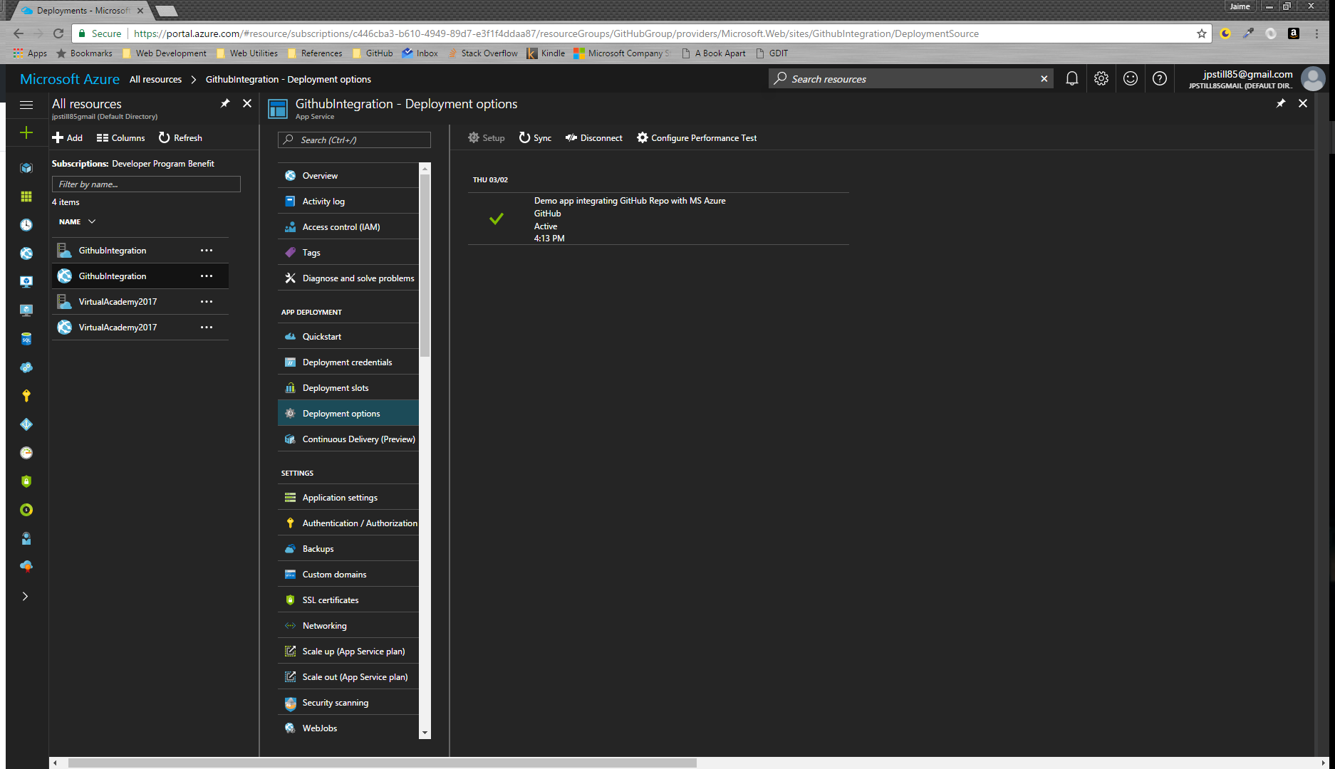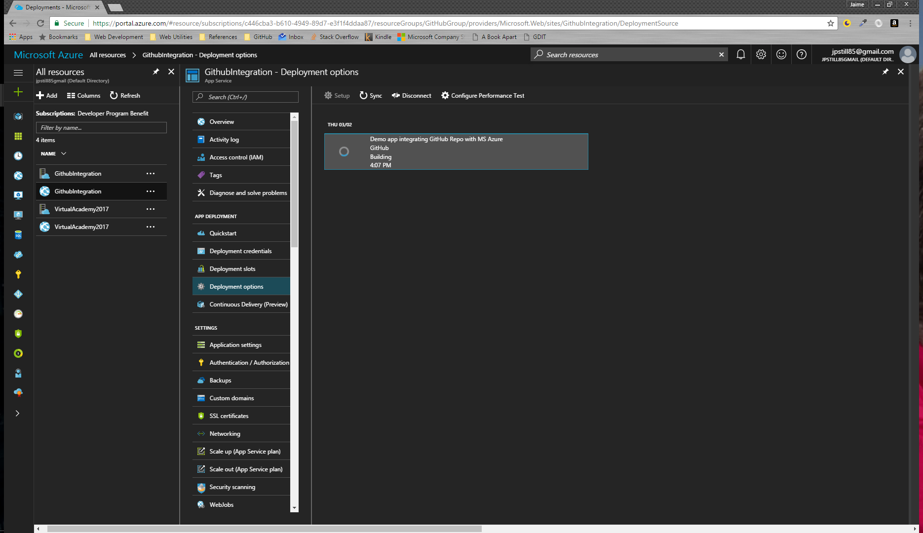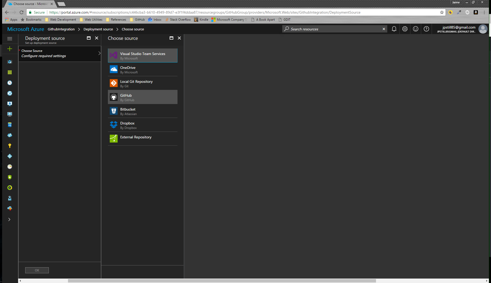 Open the web app dashboard, click Deployment Options, set the source as GitHub, then click OK