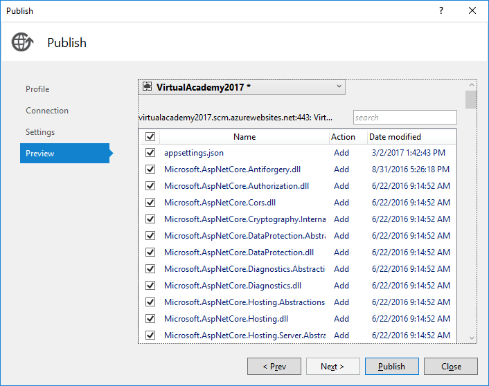 In the Preview window, you can click Start Preview to see the files affected by the publish and the action that will be taken as a result of the publish. Click Publish