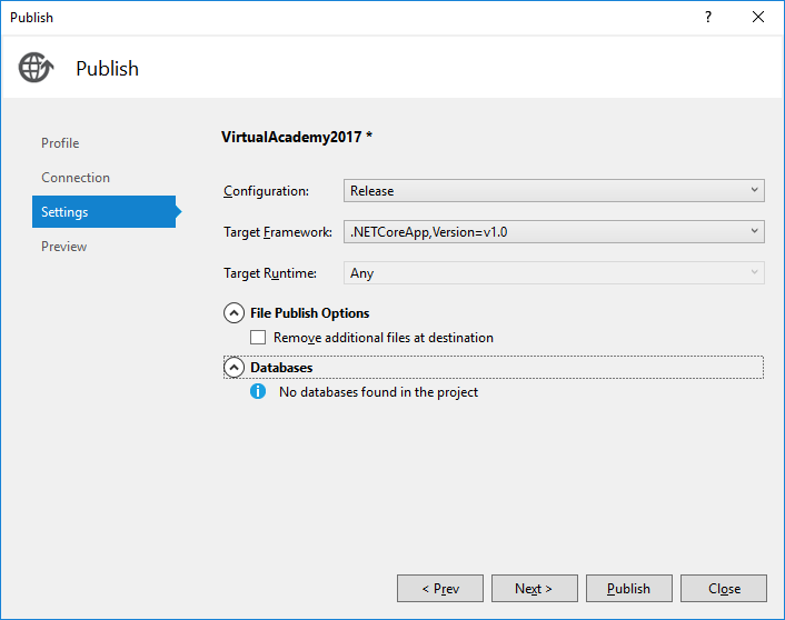 The Settings page allows you to set the configuration of the deployment, the target framework version, and specify additional File Publish Options and Database Connection Strings. Click Next