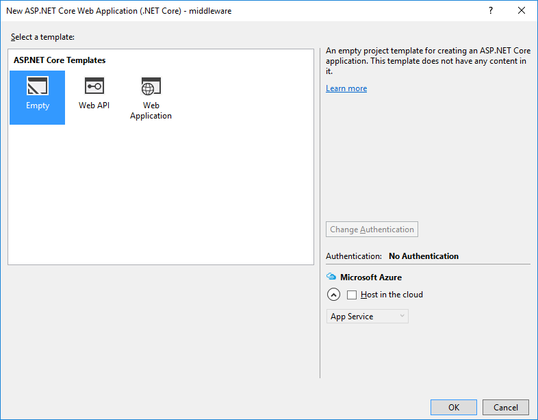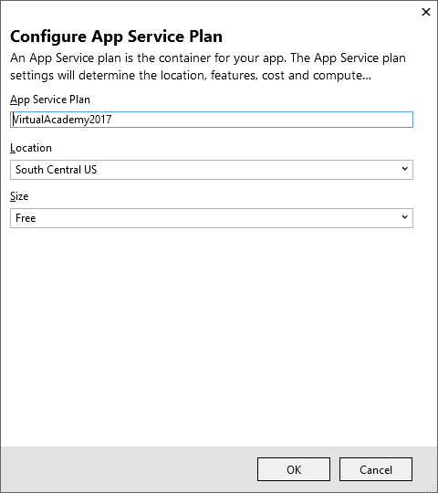 In Visual Studio, from the Create App Service window, click New next to App Service Plan. Provide a name for the service plan, select the region where the service plan will be hosted, and the size of the app service plan.