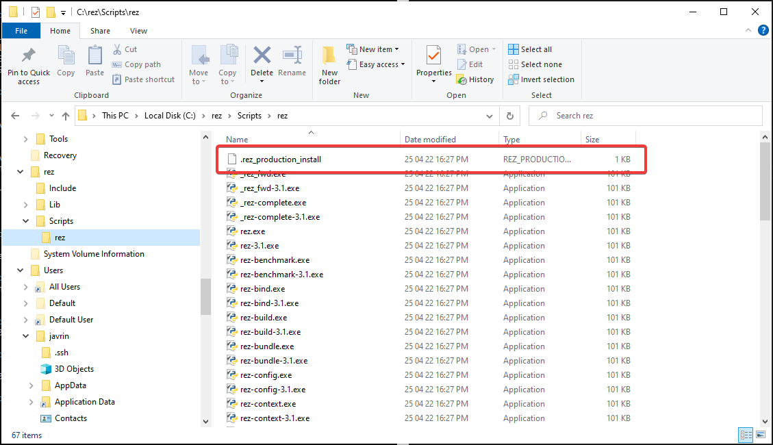 What is a "production install" directory and where is it? On Windows, rez exe binaries call python and "production install" refers to where that binary directory is located. There's a hidden file marking the directory if an `ls -la` is invoked in the directory.