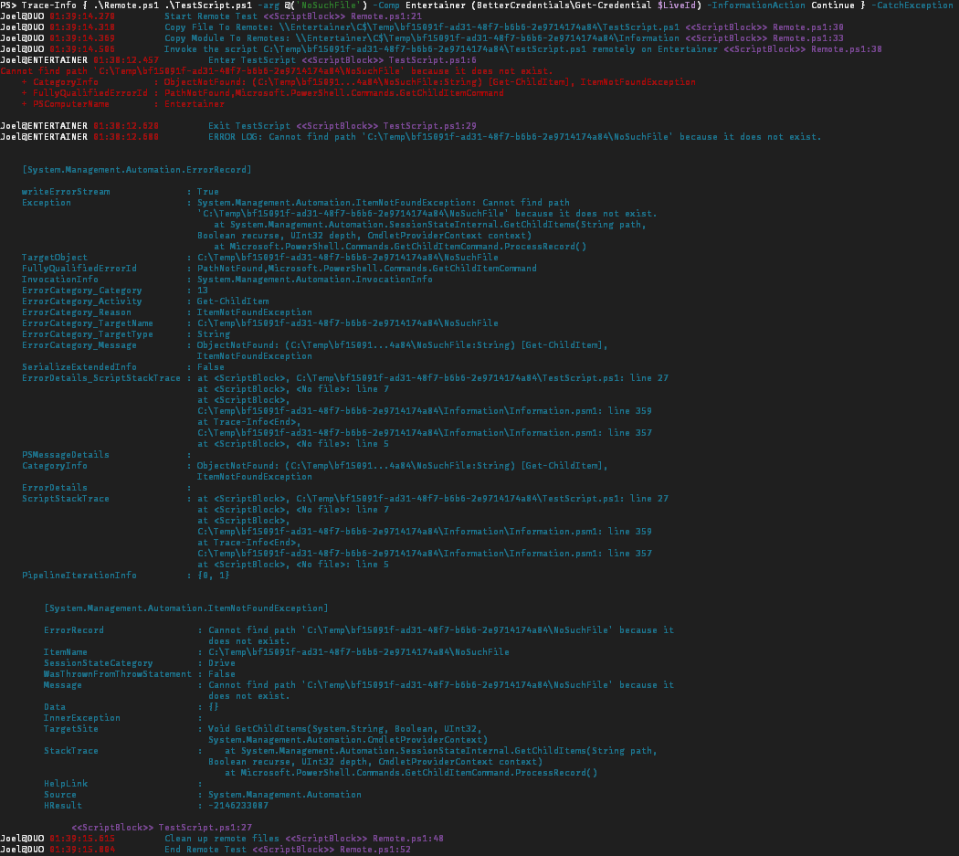 The Information module now includes a Trace-Info command which you can wrap around another command to automatically convert Write-Host to Write-Info and also capture all the Error information at the end. In this extreme case where we're making a remote call, we need to make a change at two levels. First, we need to wrap the code that runs remotely, and then we can tweak with the invocation.