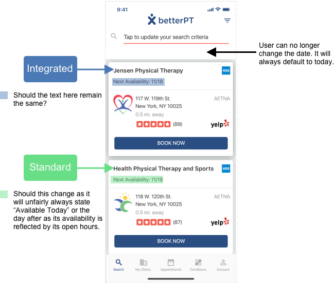- Works nicer with how we expect to implement standard clinics which is that their availability is reflected on their open hours showing times on the clinic every hour. If we put any weight on a date on this screen, the standard clinics will be showing availability everyday compared to Integrated which would be unfair.