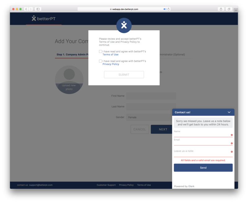 I had first registered and validated an account using [email protected]. After validating the account, I was brought to the screen below where I need to accept terms & policy. If I hit the Contact us button hovering in the lower right, it brings up a window for me to enter in Name/E-mail and leaving a note. When tapping in these I can't seem to type in anything. I'm able to hit Send where it properly displays the various errors. Something seems to be going on here when attempting to tap in or type anything in these fields. I don't even think they're becoming active in that the taps are doing nothing.