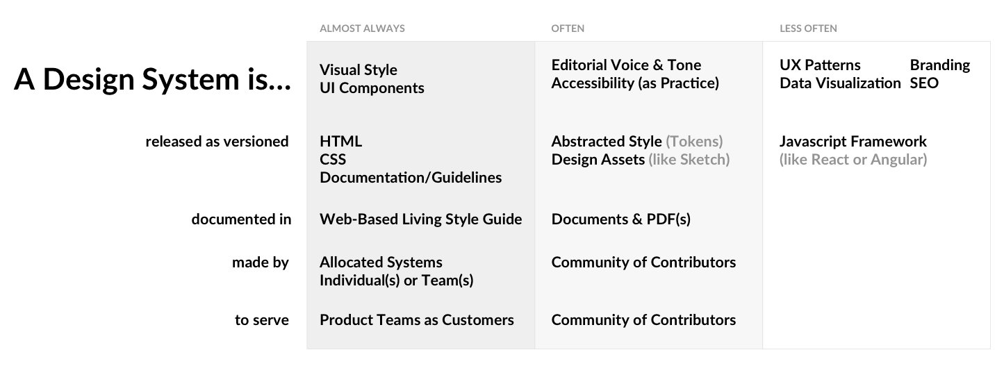 Formally, a system is a set of interconnected parts forming a unified whole. In the case of design systems, this definition actually alludes to not one but three interrelated systems you’ll need to solve for to be successful:
