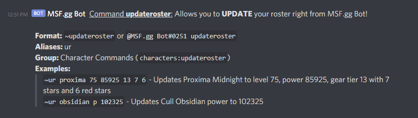 I have found the easiest way to keep the bot up to date is to just use the ~ur command in the roster progress channel when I upgrade any characters. Here is a screenshot example of me upgrading some Asgardians. If you mess up the syntax the bot will tell you how to fix it. I've also included the ~ur command help from the bot below.