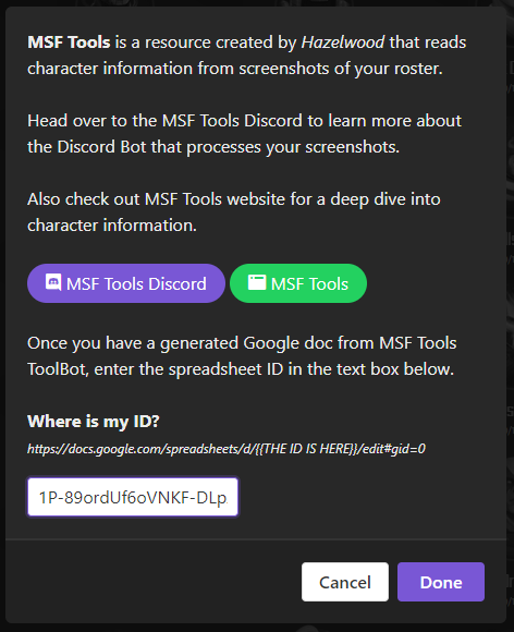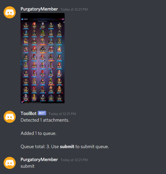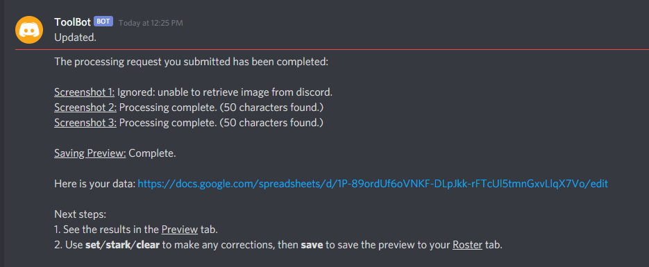 You can also just use screenshots once a week if you want to upload bulk instead of doing it one at a time. Simply upload your screenshots to the bot again, and once they are confirmed in your spreadsheet use the command ~ur toolbot, this will have msf.gg pull the latest data from your Toolbot spreadsheet.