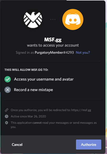 - This will bring you to the discord login web page, login and authorize the MSF.gg App.