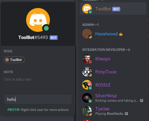 Once toolbot is complete, go back into discord, and in the #Bots channel, type ~ur toolbot .