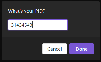 - Enter your PID. This can be found in game after clicking your profile picture. Click done.