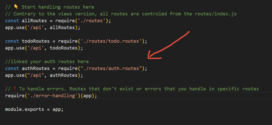 app.use("/api", authRoutes);Once you've linked it, your app.js file might look like this somewhat
