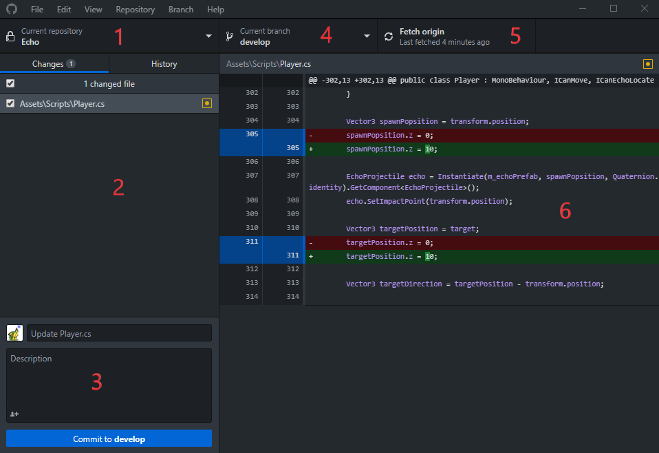 - The second box is for the commit description. (Ex: "Change z position of spawned projectile").