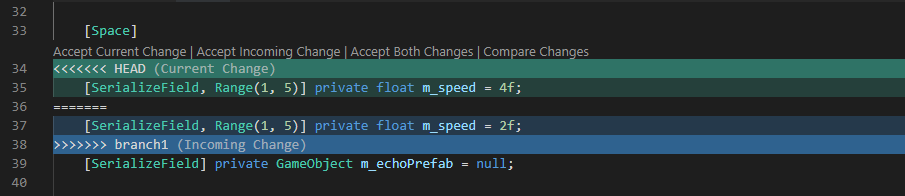On the example above, the modifications are not important. We just changed the player's speed. If you know which version you want to keep, simply click on Accept Current Change or Accept Incoming Change (above the green line) to keep respectively your modifications, or the changes on the other person who worked on the file, and delete the other version.