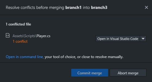 If a wild conflict appears, in the absence of capturing it with a pokéball, GitHub Desktop will offer to open it in Visual Studio Code (if it is installed on your machine) to resolve it.
