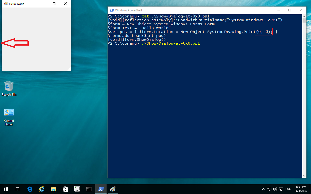 | $set_pos = { $form.Location = New-Object System.Drawing.Point(0, 0); } | |