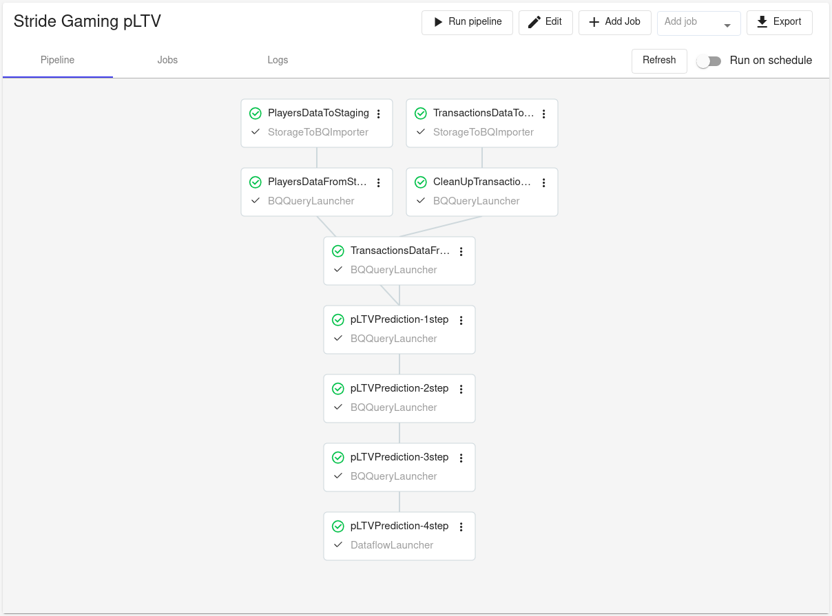 In DELVE CRMint instance where was created a pipeline called Stride Gaming pLTV, that includes the following jobs: