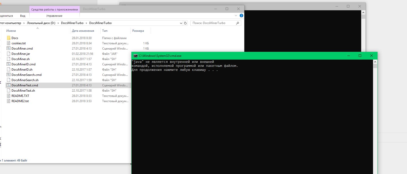 Такое бывает когда в папке нет DocsMiner.jar, либо скрипт запущен от администратора.