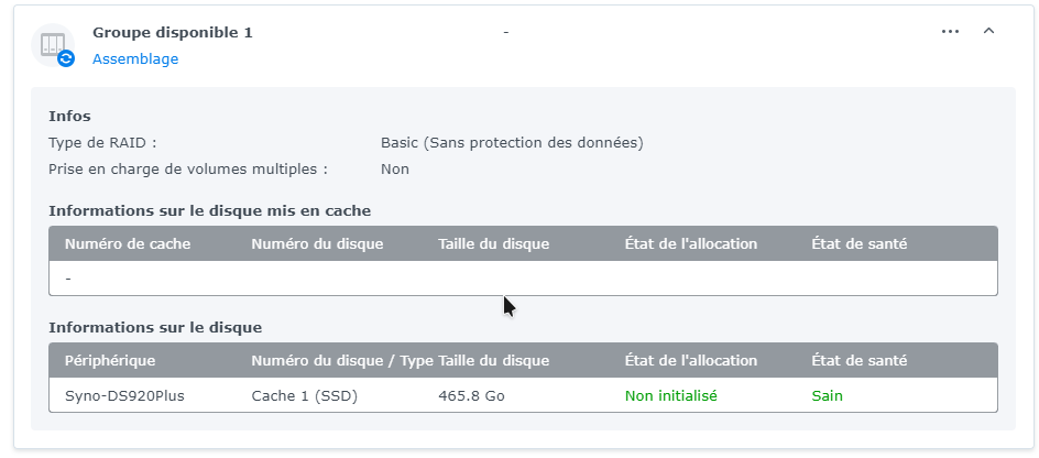 Pour la création d'un disque en Basic, il faut créer une unique partition en RAID1 afin que DSM la reconnaisse. (C'est ce que fait DSM quand il crée un volume basic.)